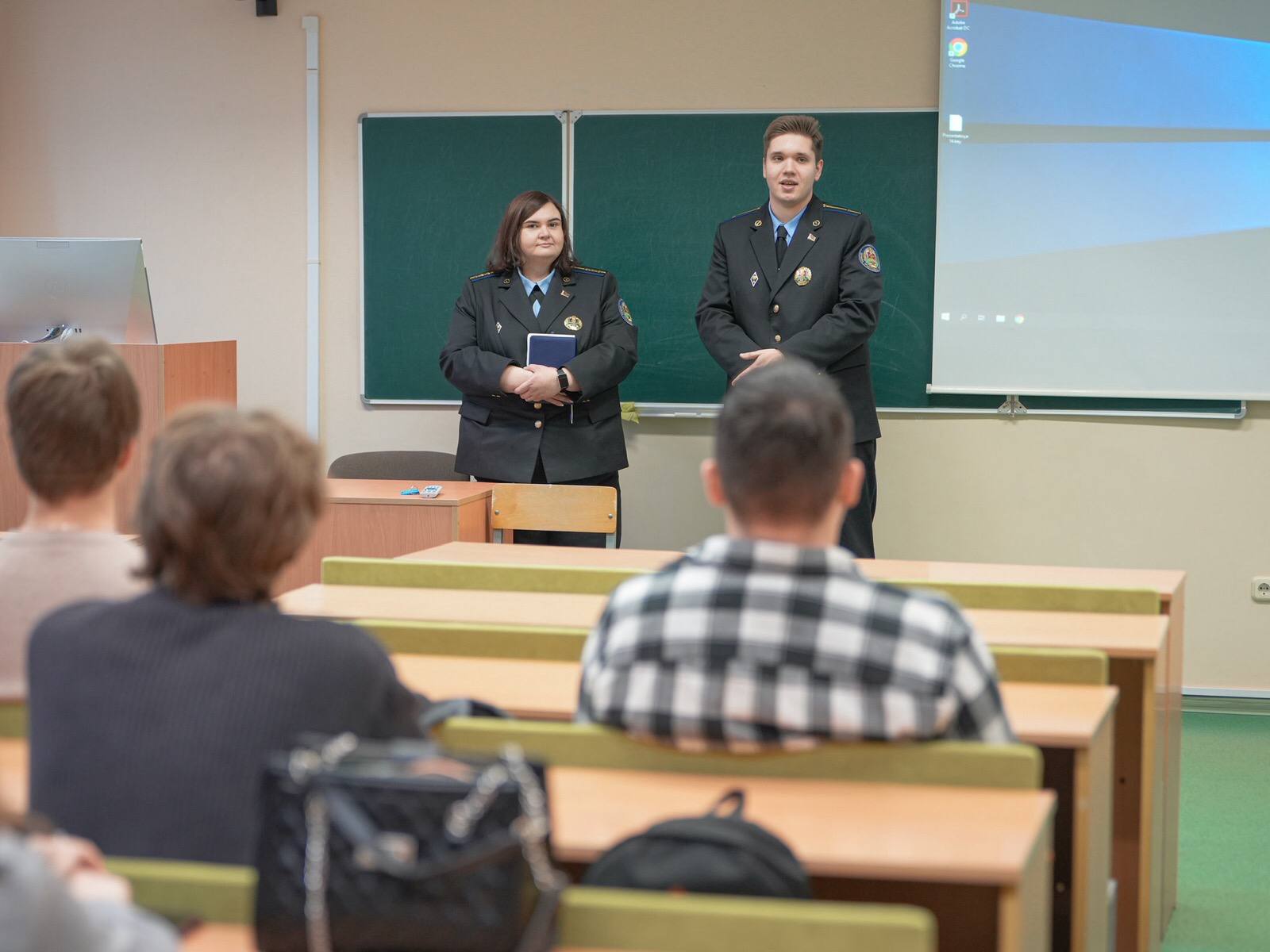 У рамках папулярызацыі прафесіі судовага выканаўцы намеснік начальніка аддзела прымусовага выканання Заводскага раёна г. Мінска Кацярына Кавачавіч і судовы выканаўца Арсеній Аўсянскі выступілі перад студэнтамі філіяла Расійскага дзяржаўнага сацыяльнага ўніверсітэта ў г. Мінску.