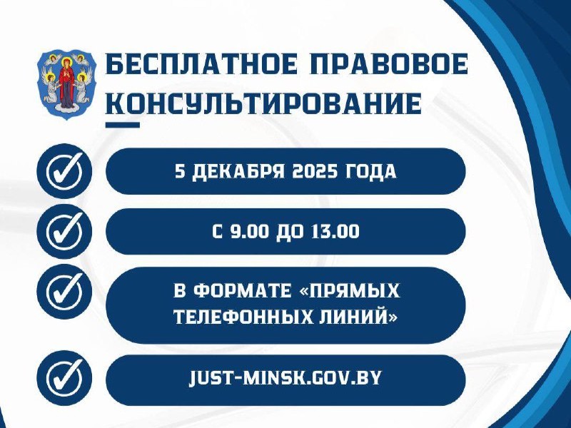 5 снежня 2025 года з 09.00 да 13.00 галоўным упраўленнем юстыцыі Мінгарвыканкама будзе праведзена акцыя па бясплатным прававым кансультаванні грамадзян, прымеркаваная да Дня юрыста.