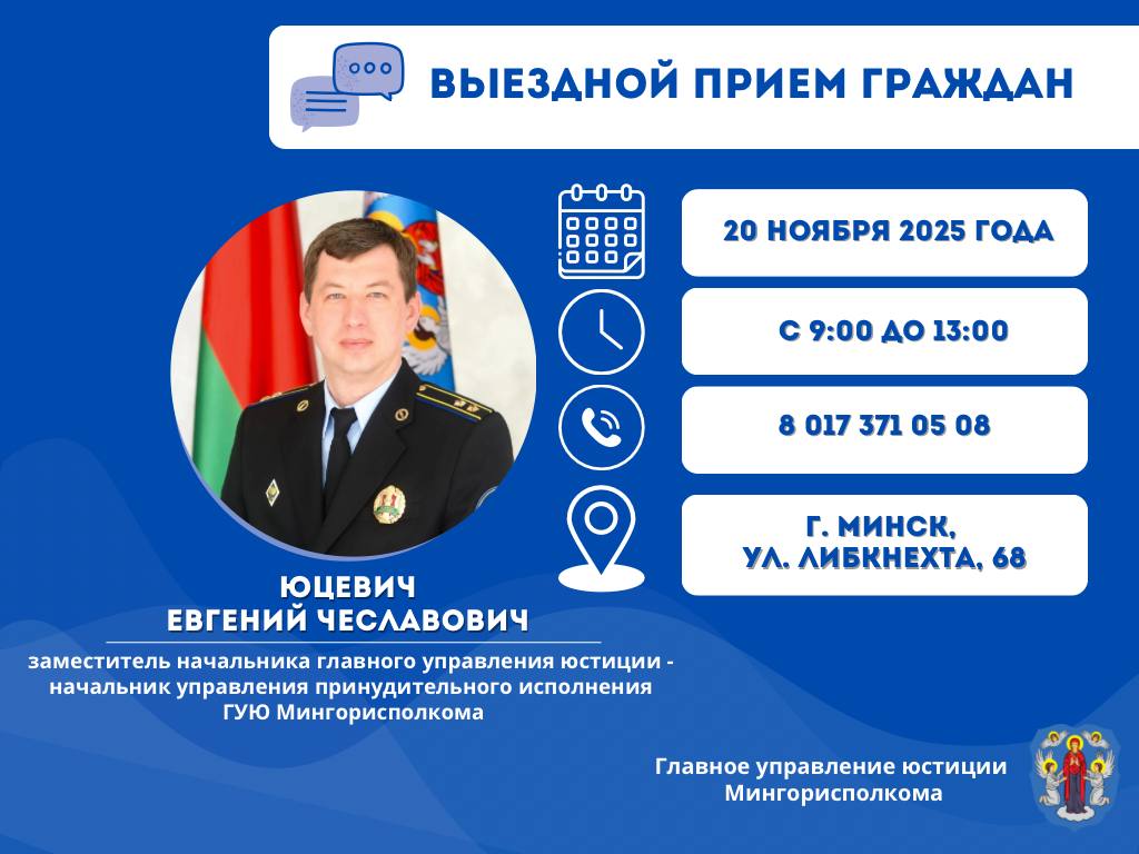 Галоўны судовы выканаўца па горадзе Мінску Юцэвіч Яўген Часлававіч 20.11.2025 з 9.00 да 13.00 правядзе выязны прыём грамадзян в аддзеле прымусовага выканання Маскоўскага раёна г. Мінска (г. Мінск, вул. Ландера, 36А) па пытаннях, якія адносяцца да кампетэнцыі ўпраўлення прымусовага выканання галоўнага ўпраўлення юстыцыі Мінгарвыканкама.