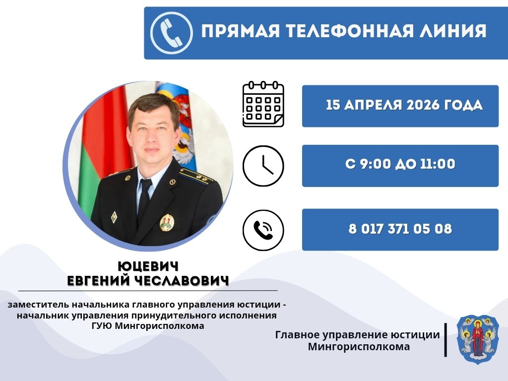 15 апреля 2026 года с 9:00 до 11:00 прямую телефонную линию по актуальным вопросам, относящимся к компетенции управления принудительного исполнения главного управления юстиции Мингорисполкома, проведет главный судебный исполнитель по городу Минску Юцевич Евгений Чеславович.