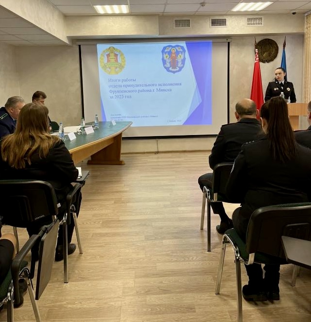 Отдел принудительного исполнения Фрунзенского района подвел итоги во главе с Главным судебным исполнителем Республики Беларусь Никелем С.Ю. Также в совещании приняли участие Прокурор Фрунзенского района г.Минска Мурашко А.В., Председатель территориального суда Денкевич А.К., представители территориального УВД. Главными вопросами обсуждения стали показатели работы отдела в целом и судебных исполнителей в частности, состояние работы с обращениями граждан и юридических лиц, выполнение задач, поставленных Министерством юстиции.